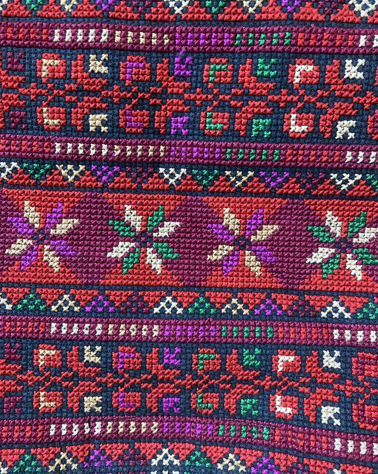 Palestinian embroidery is distinguished by its politicization (given the ongoing conflict in Israel/Palestine and resulting diasporas). It’s also distinctive because it is entirely composed of the cross-stitch technique (meaning, stitches in the shape of an “x”). There are probably some exceptions, but they are exceptions to an otherwise very regular rule.