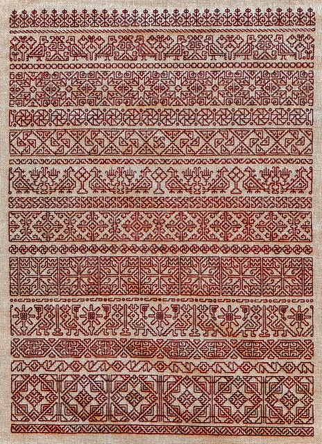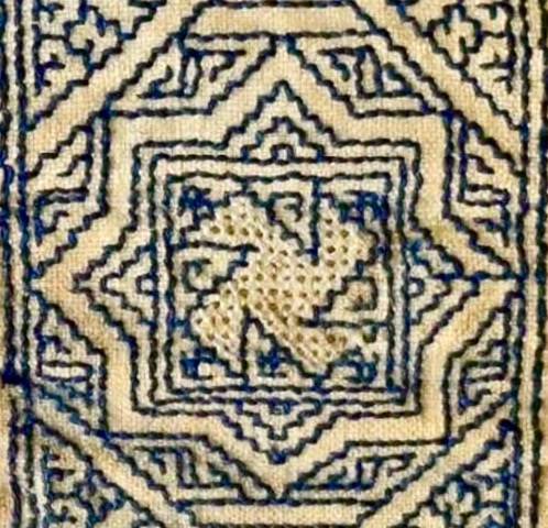 When I asked her about stitch types in Egyptian embroidery, she explained, “Although my most recent Egyptian-inspired designs focus on motifs done in running stitch (a technique familiar to modern stitchers as “blackwork”), medieval Egyptian embroidery also used cross stitch, pattern darning, and other techniques. In fact, I have a design (“Egyptian Sampler”) that was inspired by the cross stitch motifs from the medieval Egyptian textiles at the Ashmolean, and I’m currently working on a design that features pattern darning. Designs similar to the medieval Egyptian motifs — in cross stitch and running stitch — have also been found in Lebanon: in particular, in a set of textiles from a 13th-century burial site in the Qadisha Valley of Northern Lebanon.” To learn more about blackwork, consider this online class (including hands-on making) coming up in a week: Blackwork Embroidery.